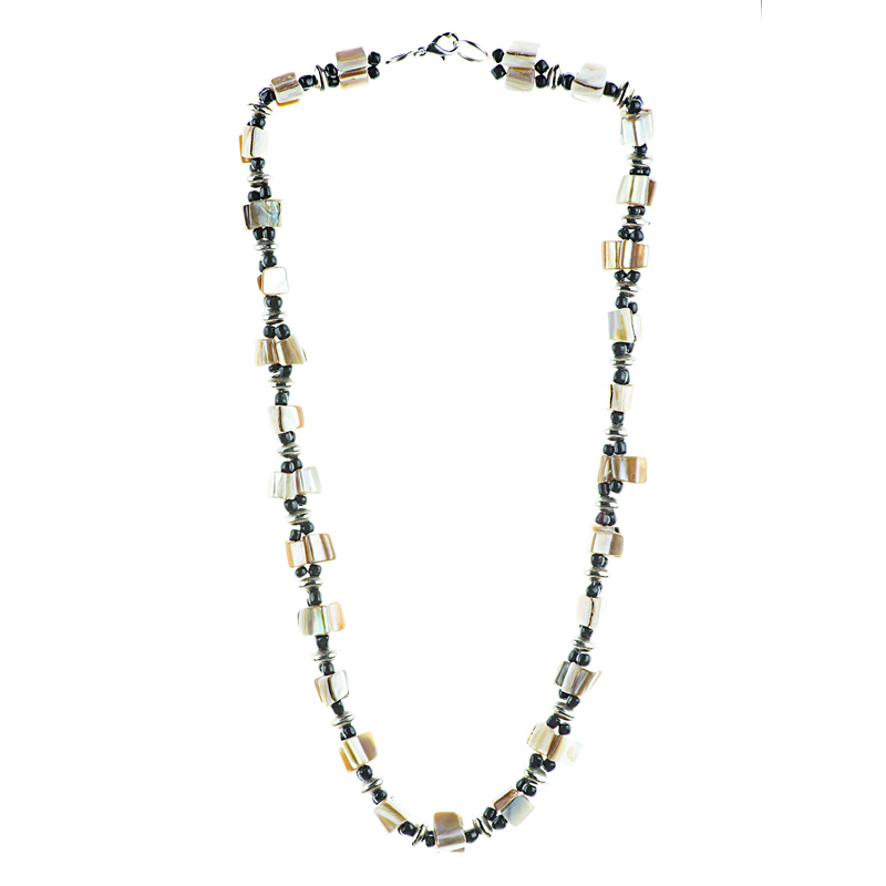Kagyló felhasználásával készült egyedi nyaklánc, mely 46 cm hosszú. A kagyló darabok bézs színűek, melyeket kis fekete gyöngyök és kis ezüst színű korongok választanak el egymástól. Hétköznapra is megfelelő viselet, de akár egy fekete koktélruhához is diszkrét ékszer lehet.