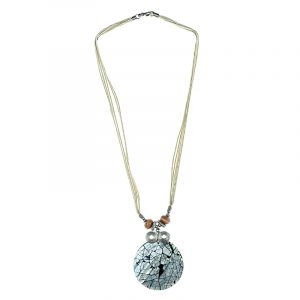 Elegáns medálján zúzott kagylóból készült, ezüstös gyöngyház csillogású sötétszürke díszítés. Sok szálú textil pánton. elhasznált anyagok: Kagyló, textil, fa gyöngyök Mérete: Medál: 4,5×4,5cm Hossz: 40cm